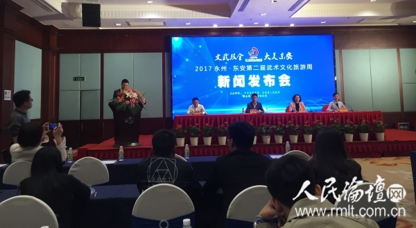 人民论坛网北京11月2日讯 文武双全,大美东安。在湖南 “武术之乡”永州东安县,11 月 11 日至 15 日将举办 2017 永州·东安第二届武术文化旅游周,上演武林高手精彩对决。11月1日,东安武术文化旅游周新闻发布会在长沙举行。