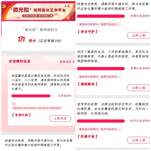 据了解,“微光粒”评价激励系统以解决群众诉求、畅通服务渠道为导向,开发了“管理员审核”“事件申报”“积兑统计”等功能模块,后台系统上还会实时显示处置状态,上线“日、周、月”在线打卡功能,激励微网格长到一线开展工作,实现治理单元的最小化、服务效能的最大化。