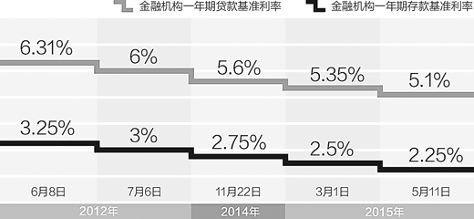 中国人民银行决定,自2015年5月11日起下调金融机构人民币贷款和存款基准利率。金融机构一年期贷款基准利率下调0.25个百分点至5.1%;一年期存款基准利率下调0.25个百分点至2.25%,同时结合推进利率市场化改革,将金融机构存款利率浮动区间的上限由存款基准利率的1.3倍调整为1.5倍;其他各档次贷款及存款基准利率、个人住房公积金存贷款利率相应调整。