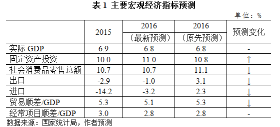 根据这些新情况,在考虑了我国积极财政政策力度加大和继续保持稳健货币政策的假设前提下,我们基于计量经济模型对2016年宏观经济预测进行了更新。由于房地产和基建投资增速加快带来的正面影响基本对冲了贸易顺差减速带来的负面影响,我们维持2016年全年GDP增速6.8%的基准预测不变。我们对宏观指标预测的主要变化包括上调固定资产投资增速、CPI涨幅预测和下调进出口增速预测等。