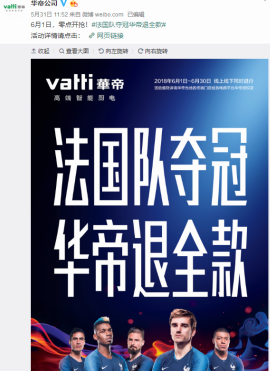 同时,华帝官微发布了包括法国队主要球员以及“法国队夺冠,华帝退全款”字样在内的活动海报,但在海报右上角有一行极小的字:活动细则详询华帝当地各终端门店或各电商平台华帝授权店。