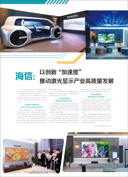 以海信为代表的中国企业积极推动激光显示产业发展,目前中国激光显示产业已走在全球前列。从技术领先到产业领先,中国激光显示产业将实现更高水平、更高质量发展。