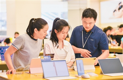 在江西省宜春市袁州区凤凰街道润达国际购物中心的电子数码产品专营店内,工作人员向消费者介绍平板电脑产品。