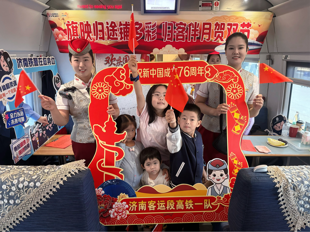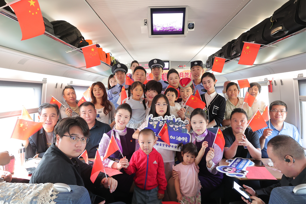 国庆期间,由国铁济南局济南客运段值乘的G169次列车车厢内暖意融融、热闹非凡。列车精心打造了一场国庆特色活动,让旅客在奔赴团圆与美景的途中,沉浸式感受别样节日氛围。