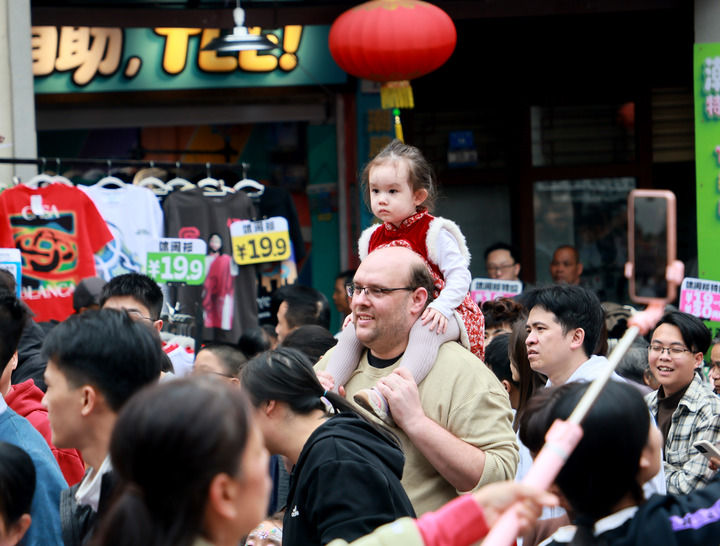 2月17日,外国游客在广东肇庆宋城骑楼街观赏龙狮巡游。新华社发(刘春林摄)