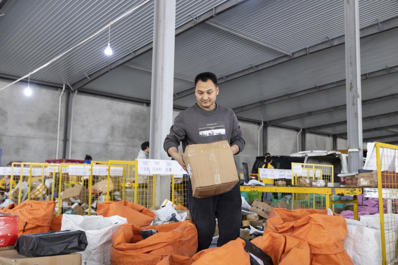 在陕西省扶风县拼多多进村中转仓,工作人员将快递分拣后再配送至乡村服务网点。王剑摄
