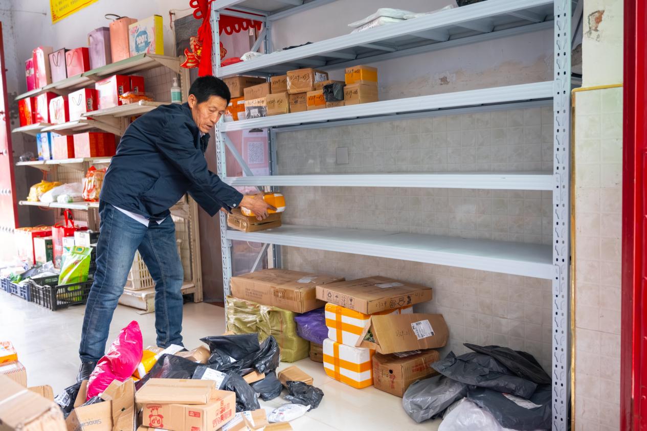 陕西省扶风县午井镇的村级拼多多驿站,站点负责人在整理快递货架。邱活摄
