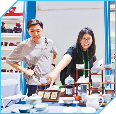 参展人员在国潮出海展区选购景德镇陶瓷。